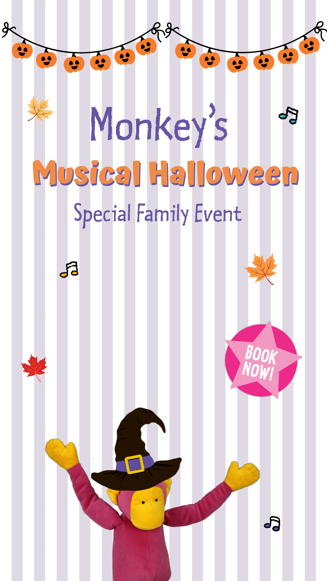 Come and celebrate your Baby's first Halloween this year with Jayne at Monkey’s Musical Halloween Events! Monkey and Mo are getting ready for some musical tricks and treats! Monkey’s Musical Halloween will be packed full of Halloween fun, singing, dancing and play, we can’t wait! Don’t forget to dress up too, treat your little one to our extra special half term Halloween event and make this half term super special! Each Event will be 45 minutes long and divided by age. Siblings are super welcome and must be booked and paid for please as we have very limited spaces available. You can also invite friends to book and come along too even if they don’t normally attend classes during the week. We are able to offer the option for 2 adults (maximum) to attend per child too, so mummies, daddies, aunts, uncles, grandparents, carers and nannies are very welcome who maybe don’t usually attend are very welcome. Do let us know if there is anything we can help you with regarding your booking, just pop us an email or give us a call.. Chelsea.westminster@monkeymusic.co.uk Or call us on 020 86767 9827